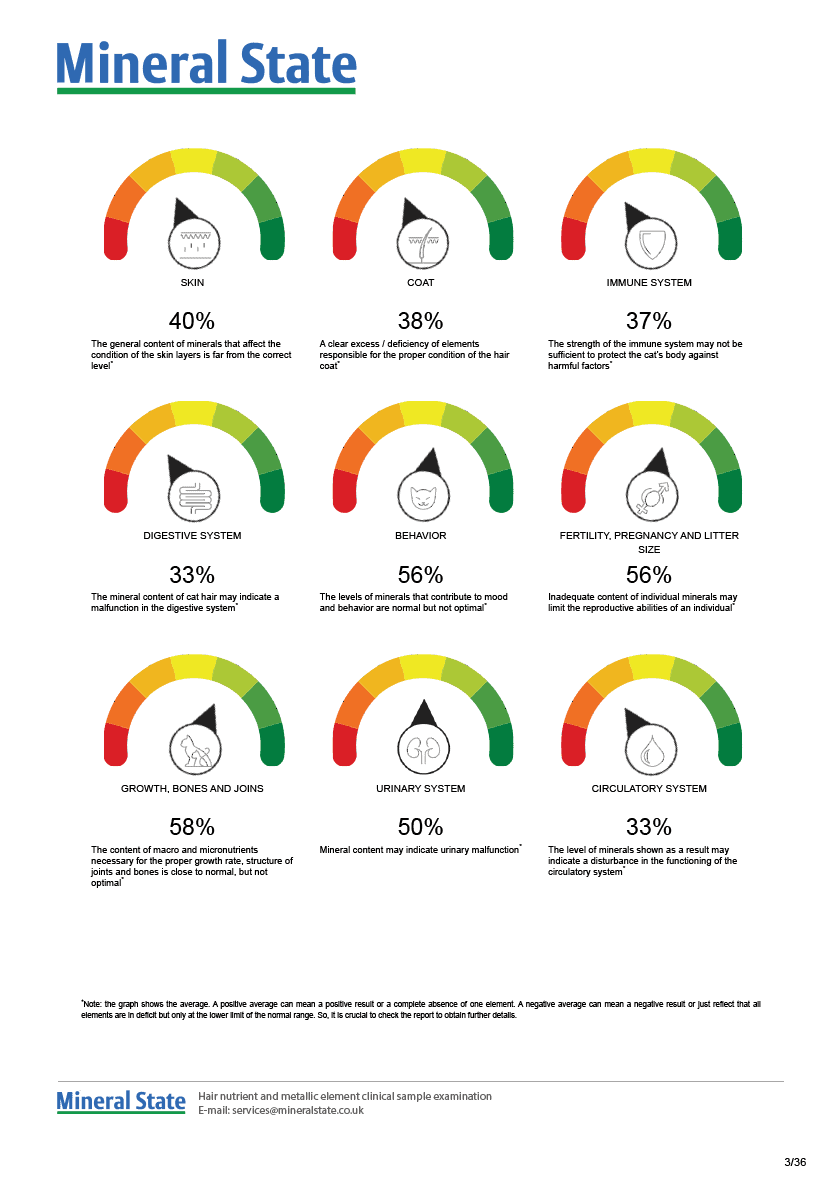 The report is very comprehensive (around 30–35 pages) and not only lists mineral and toxin levels but explains their effects on your cat’s health, behaviour, and wellbeing. Clear commentary, alongside easy-to-read charts, makes it simple for owners and breeders to understand.