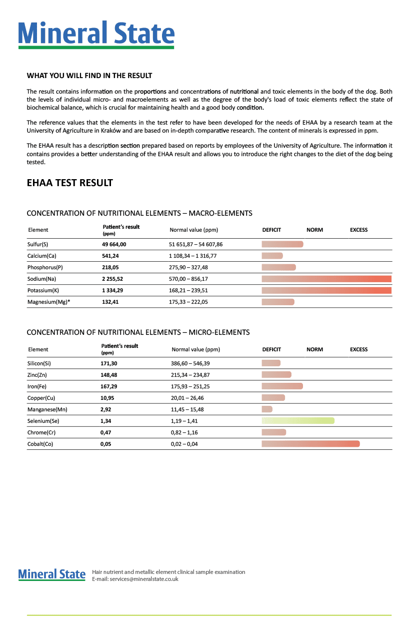 The report is highly comprehensive (around 20–25 pages) and not only shows mineral and toxin levels but explains their impact on your dog’s health and wellbeing, with easy-to-read graphs and clear commentary. This makes it a powerful tool for pet owners, trainers, and breeders alike.