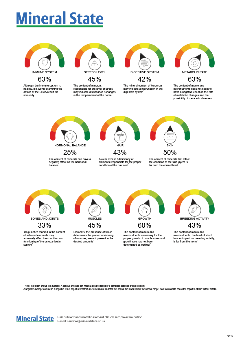 The report is extensive (typically 30+ pages) and includes detailed charts with clear explanations of how each mineral imbalance or toxic element may affect your horse’s performance, recovery, behaviour, and long-term health.